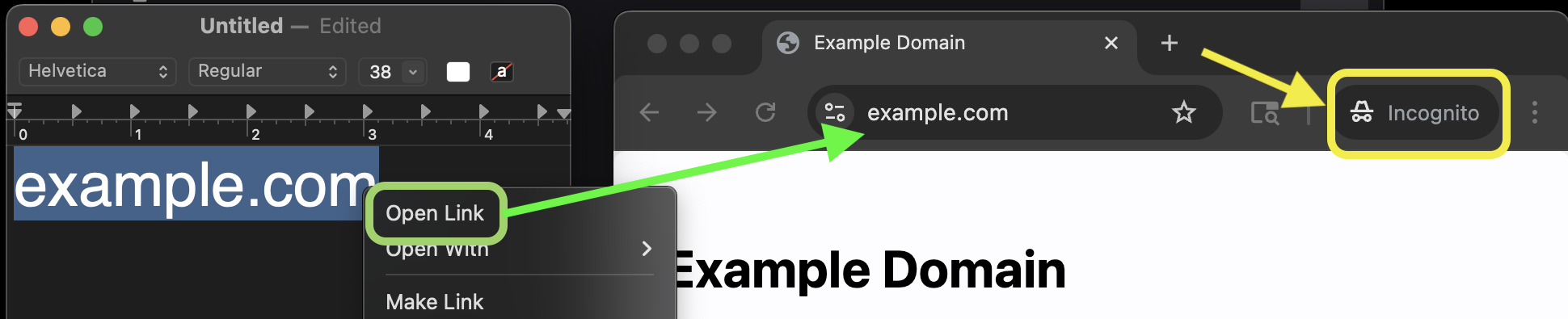 Finally, when I open example.com in some app, for example TextEdit, Linklever opens Chrome in incognito mode: