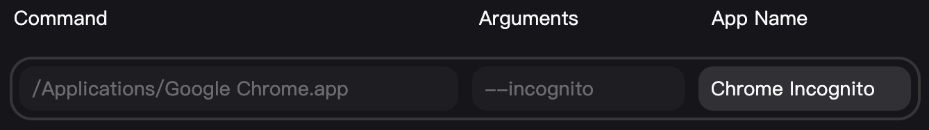 For example, in the Apps tab, I can add a custom app that includes Chrome's incognito flag: