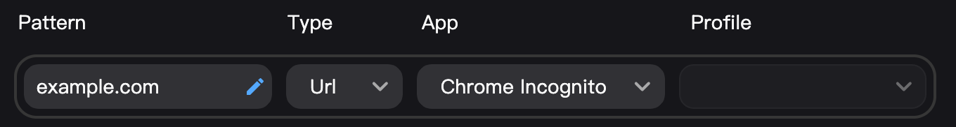 Then, in the Rules tab, I can add a rule to route example.com to Chrome Incognito: