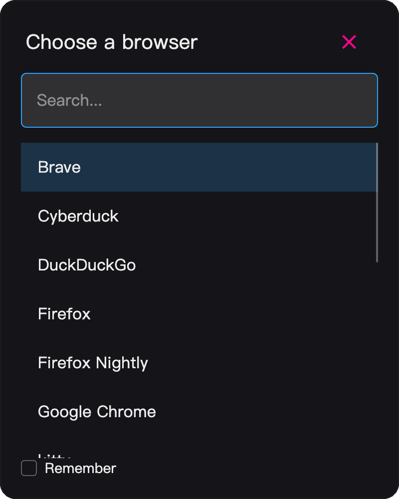 You can type to search, select a browser, and optionally check Remember so Linklever doesn't ask next time.