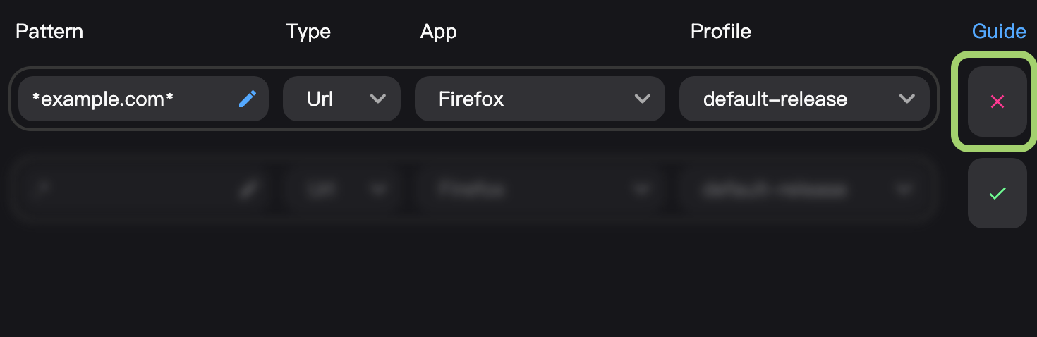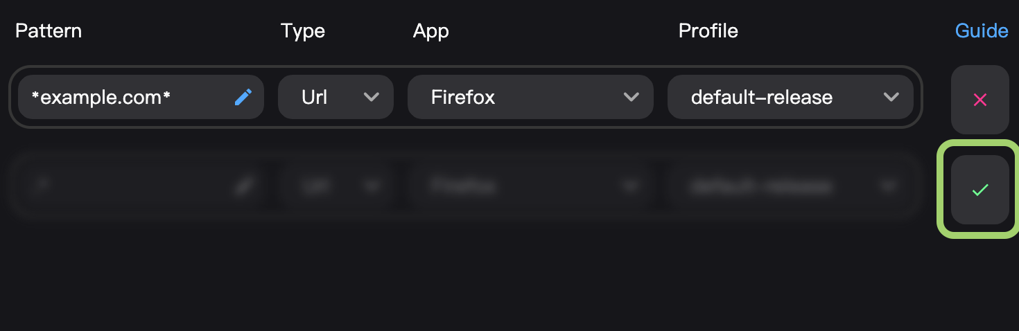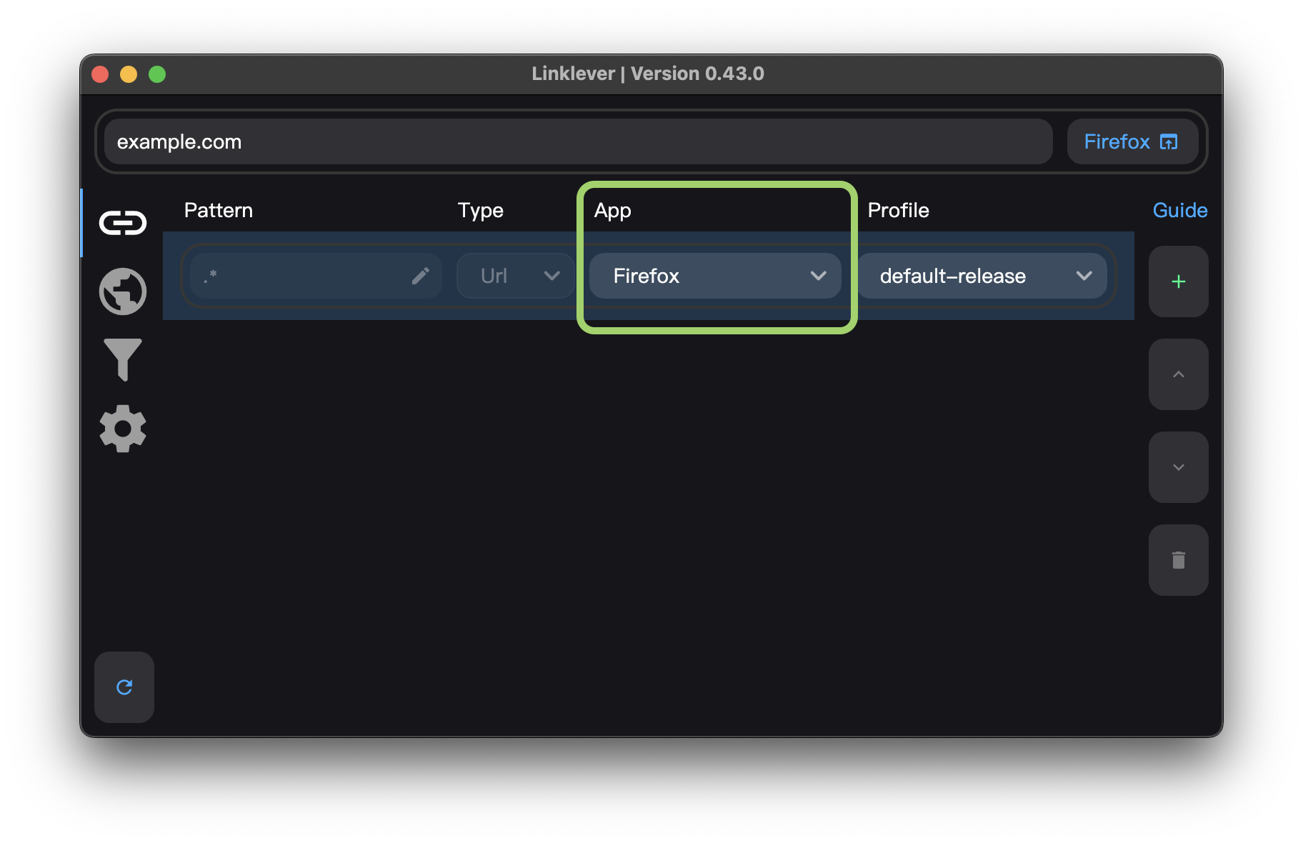 For example, if Pattern is example.com, Type is Url, and Browser is Safari, then all links for example.com will open in Safari.